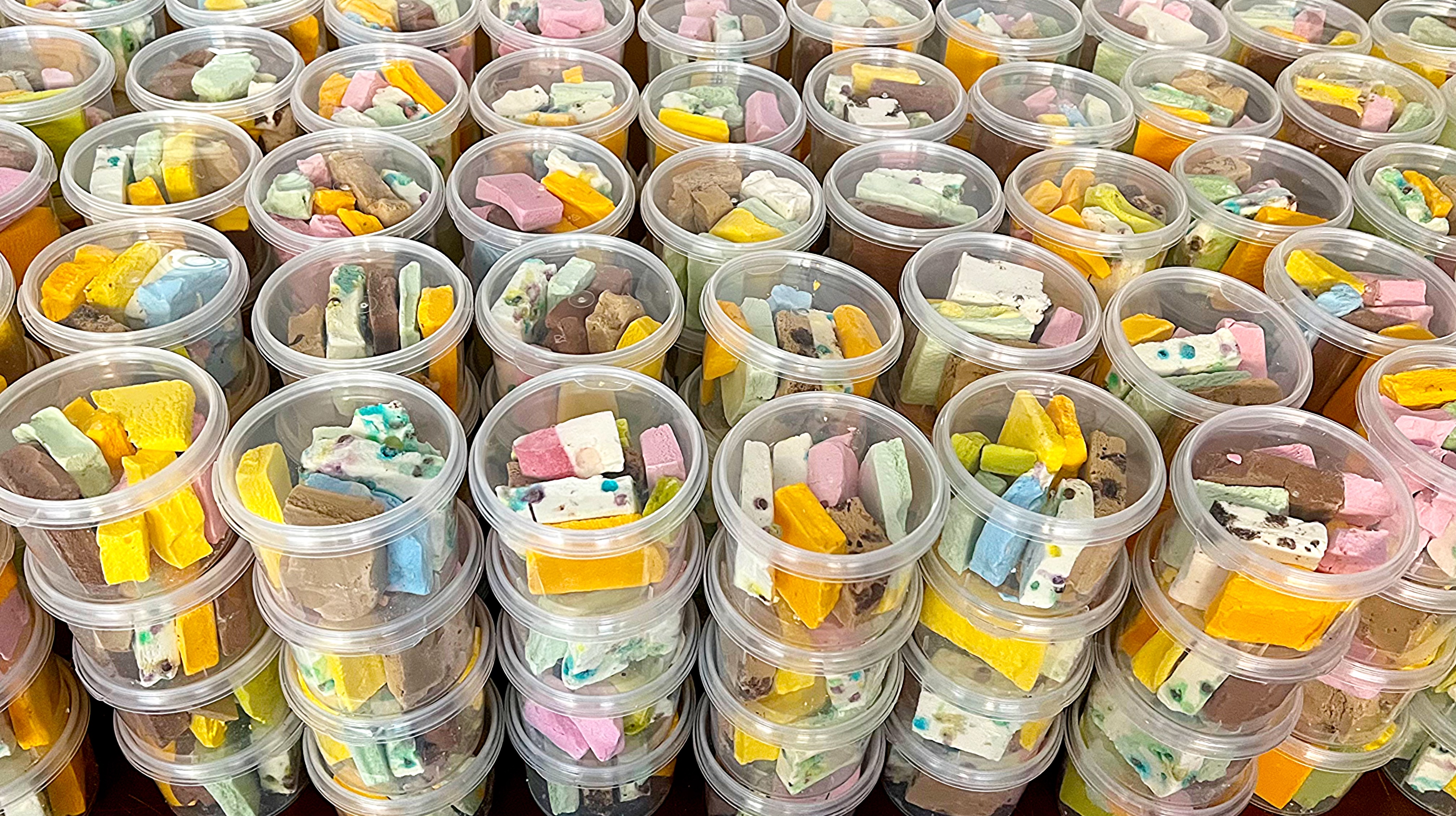 • بخش فانتزی (اسمارتیز): این طعم به خصوص برای کودکان و نوجوانان طراحی شده است. تضاد بین بافت ترد بستنی خشک و بافت شکلاتی اسمارتیز، یک تجربه هیجانانگیز ایجاد میکند.