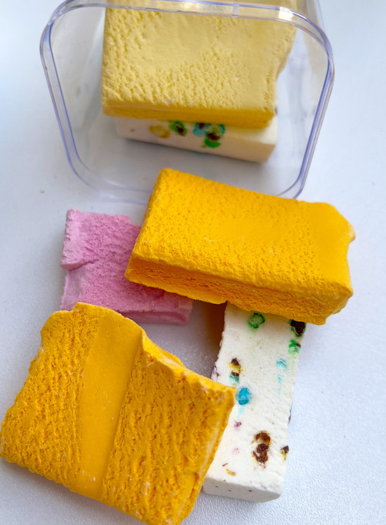 • بخش میوهای (انبه، طالبی، توتفرنگی): در این طعمها، شما از اسانسهای شیمیایی خبری نمیبینید. به محض اینکه یک تکه بستنی خشک انبه را روی زبان میگذارید، غلظت طعم میوه تازه را حس میکنید.